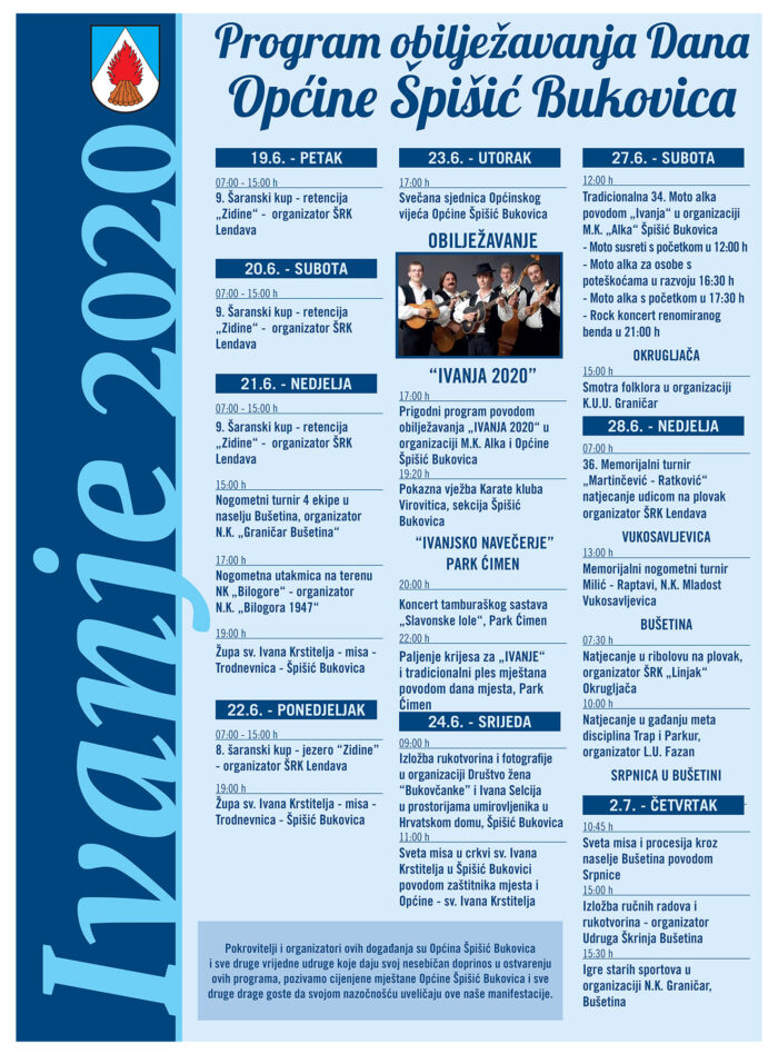 U parku Ćimen u Špišić Bukovici večer uoči blagdana svetog Ivana Krstitelja, koji se obilježava i kao Dan općine Špišić Bukovica održano je tradicionalno Ivanjsko navečerje. U organizaciji prigodnog programa, uz općinu Špišić Bukovica, sudjelovali su članovi moto kluba „Alka“. Već u rano popodne počelo je „zagrijavanje“ kuhao se odličan paprikaš za sve koji će…